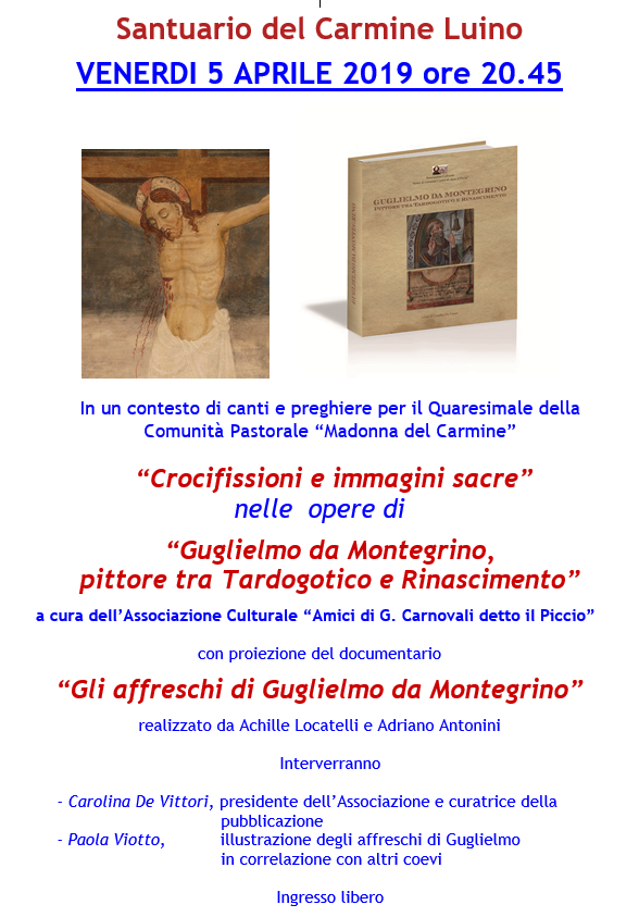 Alle ore 20.45, presso il Santuario del Carmine (Luino), Quaresimale della Comunità Pastorale, che si svolgerà in un contesto di preghiera e canti, “Crocifissioni e immagini sacre nelle opere di Guglielmo da Montegrino”, a cura dell’Associazione culturale “Amici di G. Carnovali detto il Piccio”.