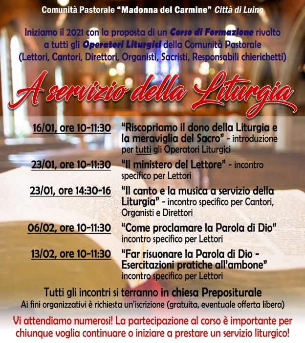 Il corso di formazione sarà dedicato in modo particolare ai lettori, ma saranno invitati al primo incontro tutti coloro che prestano il loro servizio a livello liturgico, durante le celebrazioni eucaristiche: cantori, direttori di coro, organisti, sacristi e responsabili dei chierichetti.