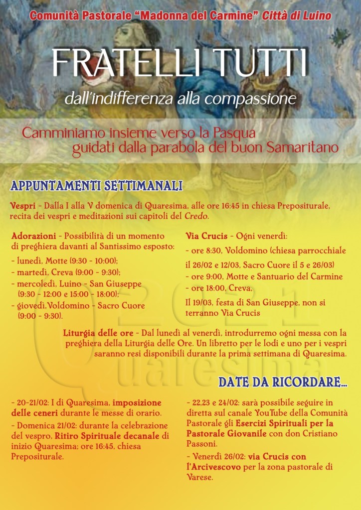 Liturgia delle ore: dal lunedì al giovedì ogni S. Messa verrà introdotta con la preghiera della Liturgia delle Ore. Un libretto per le lodi e uno per i vespri saranno resi disponibili durante la prima settimana di Quaresima.