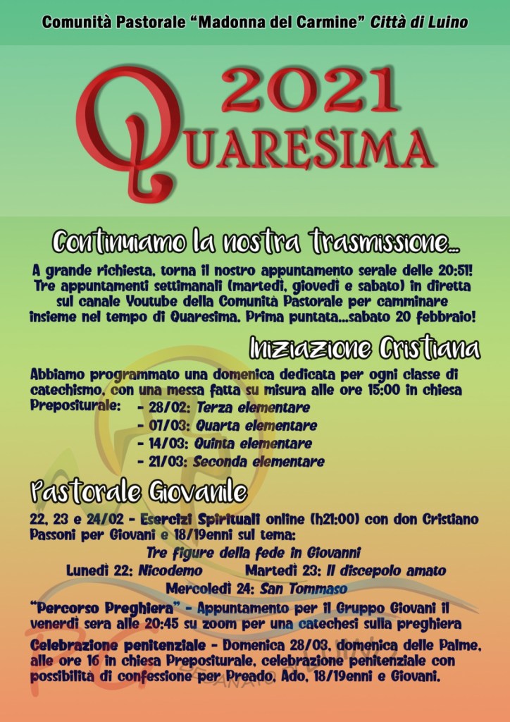 Celebrazione penitenziale: domenica 28 marzo – domenica delle Palme – alle ore 16, in Prepositurale (Luino), ci sarà una celebrazione penitenziale con possibilità di confessioni per Preado, Ado, 18/19enni e Giovani.