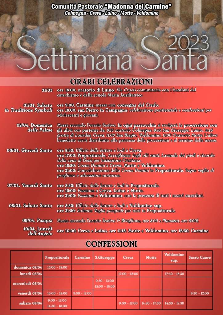 Tutte le SS. Messe seguono l’orario festivo. In ogni parrocchia si svolgerà la processione con gli ulivi con partenze alle 9.15 dall’oratorio di Colmegna, alle 9.45 da San Giuseppe (Luino), alle 9.45 dalla Grotta di Lourdes a Creva e alle 11.00 da San Biagio a Voldomino e dall’oratorio delle Motte. L’ulivo benedetto verrà distribuito alla partenza delle processioni e al termine delle celebrazioni.