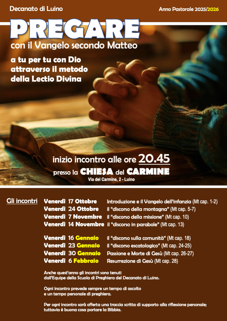 Quest’anno pregheremo con il Vangelo di Matteo, sempre seguendo il metodo della Lectio Divina, insieme all’équipe della Scuola di Preghiera decanale.