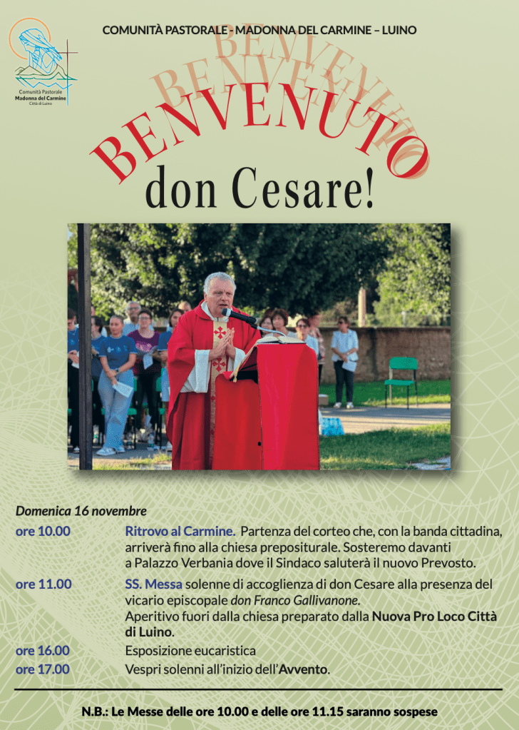 Domenica 16 novembre, prima Domenica di Avvento, accoglieremo ufficialmente don Cesare Zuccato come nostro nuovo parroco e prevosto.