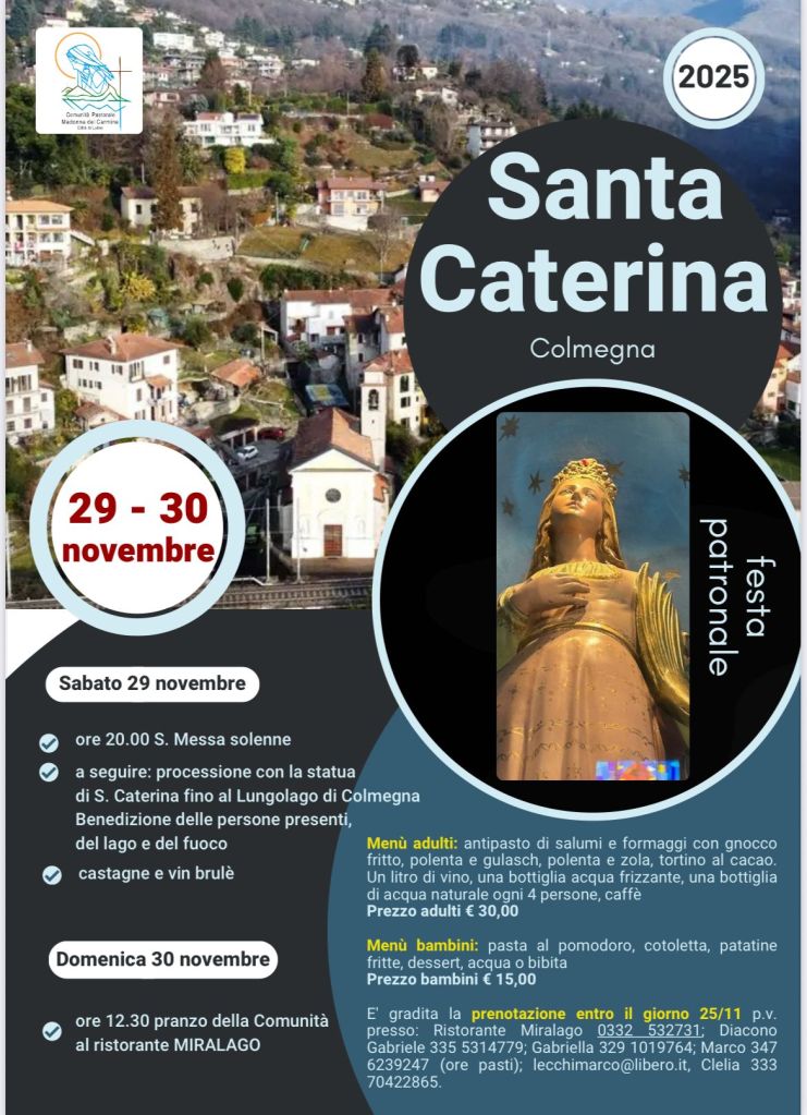 - Alle 20.00 S. Messa solenne nella chiesa parrocchiale di Colmegna, seguita dalla processione con la statua di Santa Caterina fino al lungolago, con la benedizione delle persone presenti, del lago e del fuoco. A seguire castagne e vin brulé per tutti.
