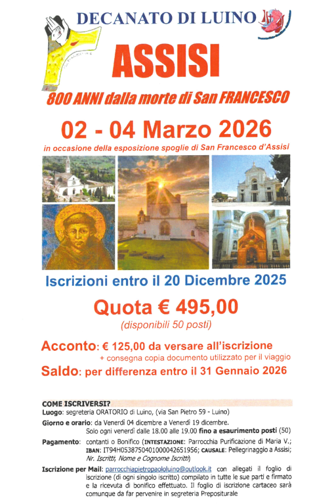 Il Decanato di Luino propone, in occasione degli 800 anni dalla morte di San Francesco e dell’esposizione delle sue spoglie, un pellegrinaggio ad Assisi dal 2 al 4 marzo 2026.