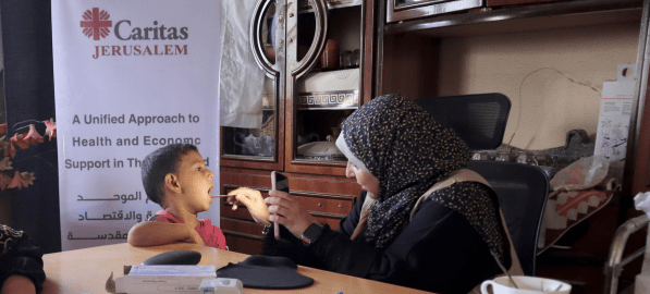Caritas Gerusalemme, dopo una prima valutazione, ha riscontrato la necessità di fornire assistenza materna e infantile per le persone bisognose. Abbiamo costruito una nuova clinica medica proprio davanti al Palestine Stadium nel quartiere Al Rimal a Gaza City. E si può vedere quel mare di tende e ci sono madri e bambini che vengono in questo centro medico, dove ci sono quattro medici, un pediatra, un ginecologo che forniscono servizi salvavita e assistenza sanitaria di base a questi bambini e donne e lì noi forniamo anche medicinali gratuiti.