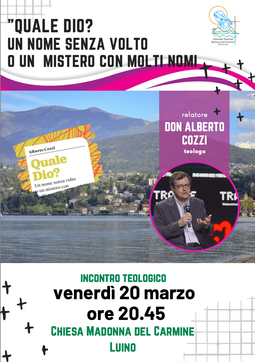 Venerdì 20 marzo alle 20.45, al Santuario del Carmine (Luino), si terrà un incontro teologico con don Alberto Cozzi dal titolo “Quale Dio? Un nome senza volto o un mistero con molti nomi”.