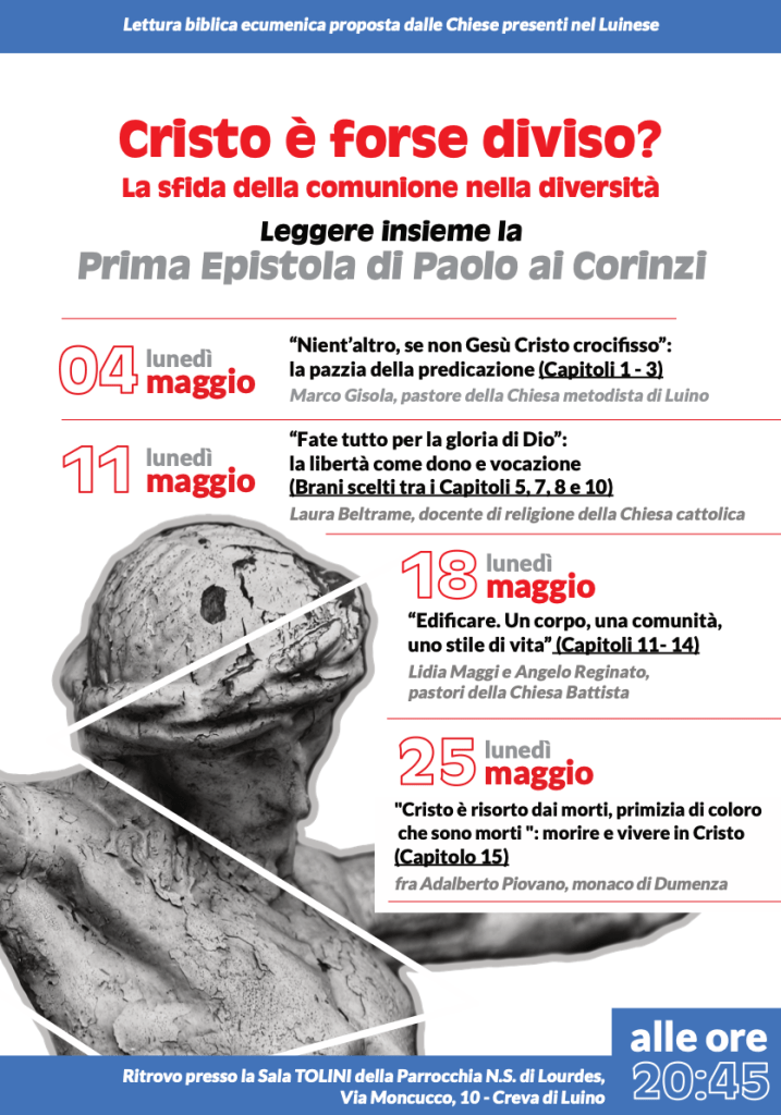 Dal 4 al 25 maggio quattro incontri presso la Sala Tolini (Parrocchia di Creva) per leggere insieme la Prima Epistola di Paolo ai Corinzi.